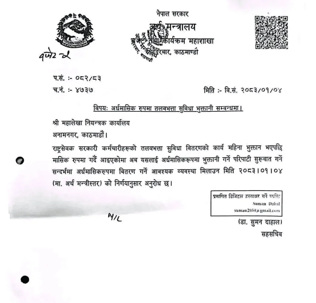 काठमाडौँ । सरकारले राष्ट्रसेवक सरकारी कर्मचारीहरूका लागि तलबभत्ता वितरणको नयाँ र सहज व्यवस्था लागू गरेको छ। अर्थ मन्त्रालयले अबदेखि कर्मचारीहरूलाई अर्धमासिक रूपमा (महिनाको दुई पटक) तलब उपलब्ध गराउने निर्णय गरेको हो। गत शुक्रबार मन्त्रालयले महालेखा नियन्त्रक कार्यालयलाई पत्र लेख्दै यो नयाँ व्यवस्था कार्यान्वयनका लागि निर्देशन दिएको छ।