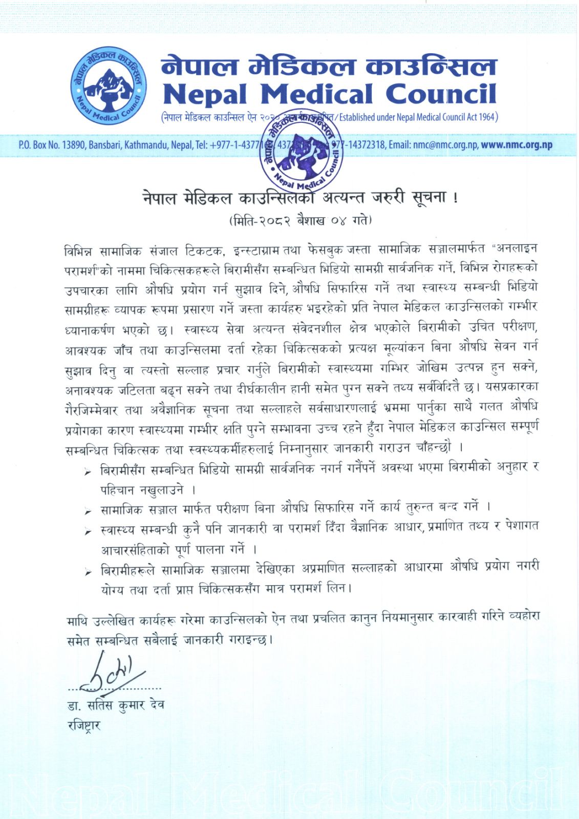 यसैगरी, सामाजिक सञ्जालमा स्वास्थ्यसम्बन्धी जानकारी वा जनचेतना फैलाउँदा समेत वैज्ञानिक आधार र प्रमाणित तथ्यहरूलाई मात्र प्रयोग गर्न भनिएको छ। प्रचलित मेडिकल मापदण्ड बाहिर गएर दिइने सल्लाहले समाजमा गलत सन्देश जाने भएकाले यसमा सचेत रहन चिकित्सकहरूलाई सूचित गरिएको छ।