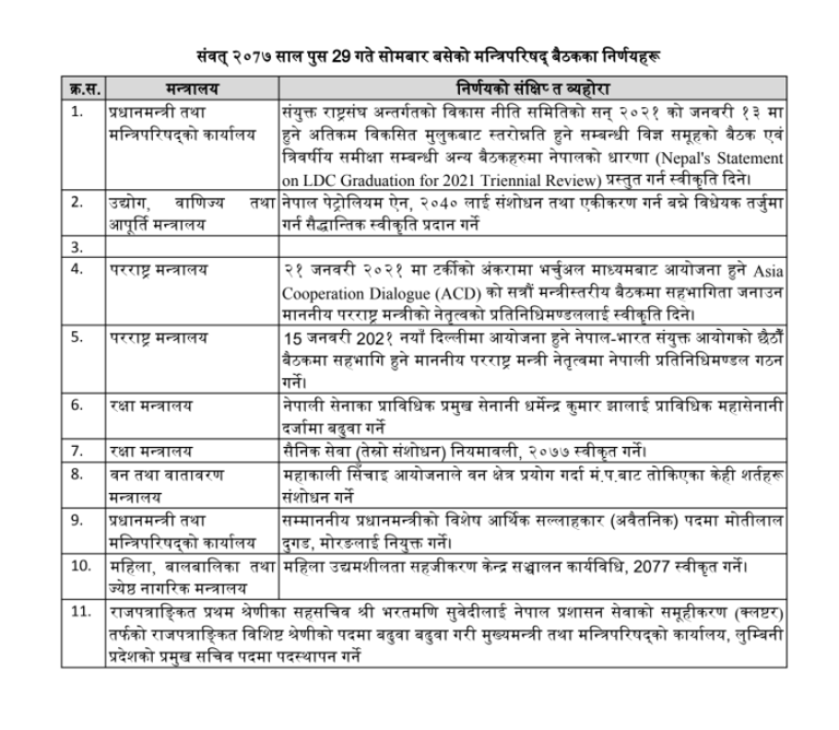 बुधबार पत्रकार सम्मेलनमार्फत् सरकार प्रवक्ता एवं सञ्चार तथा सूचना प्रविधि मन्त्री पार्वत गुरूङले पुस २९, माघ ५ र ११ गते बसेको मन्त्रिपरिषद् बैठकका निर्णय सार्वजनिक गरेका हुन्। पुस २७ गते सोमबार बसेको मन्त्रिपरिषद् बैठकले गरेका ११ निर्णयमा ७ औं नम्बरमा सैनिक सेवा नियमावली (तेस्रो संसोधन) स्वीकृत गर्ने निर्णय भएको उल्लेख छ।