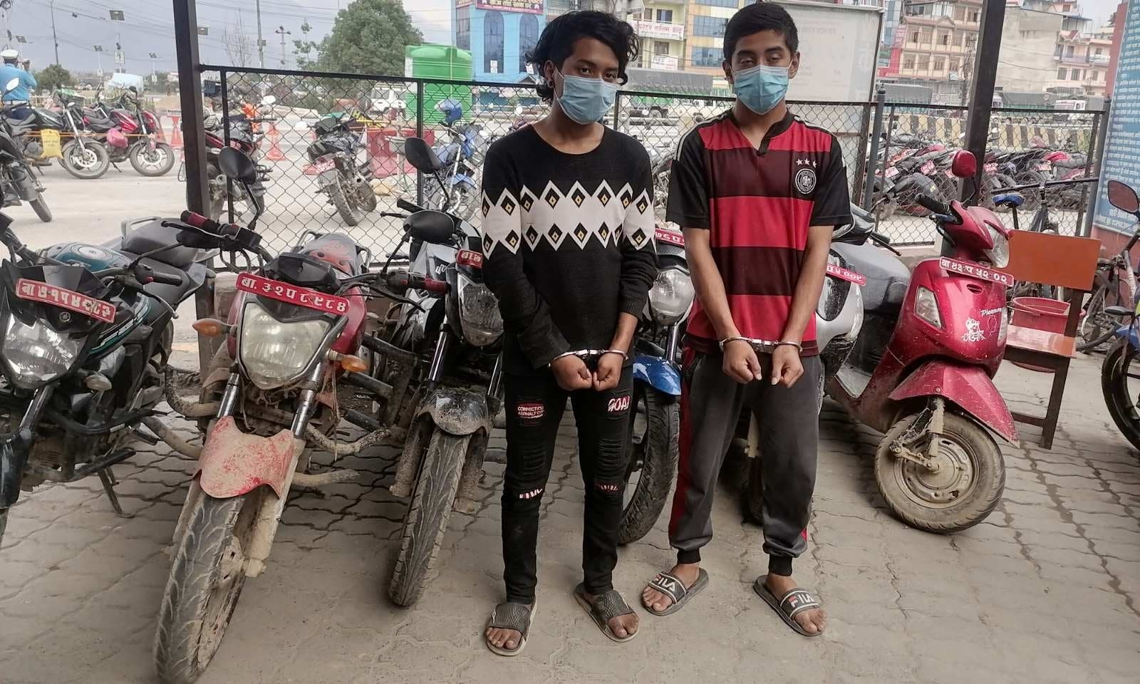 महानगरीय प्रहरी प्रभाग कोटेश्वरका इन्सपेक्टर सुरेशराज भट्ट नेतृत्वको टोलीले उनीहरुलाई पक्राउ गरेको हो । महानगरीय प्रहरी परिसर काठमाडौँका प्रवक्ता एसपी रमेश बस्नेतका अनुसार चोरी गरेको ४ वटा मोटरसाइकल र दुई वटा स्कुटर प्रहरीले बरामद गरेको छ ।