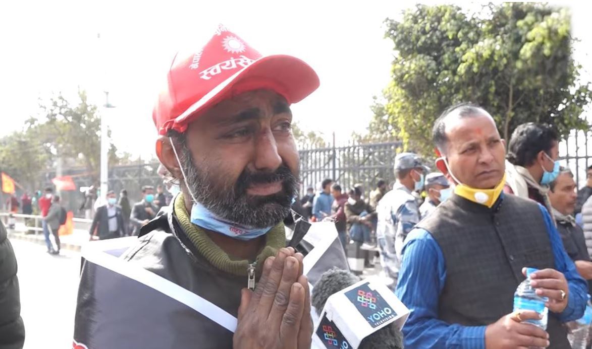 यी व्यक्ति हुन् तनहुँबाट आएका अर्जुन पौडेल । उनलाई प्रदर्शनसँग कुनै सरोकार छैन । एजेण्डा के हो त्यो पनि थाहा छैन । उनलाई यति थाहा छ, प्रदर्शनमा सहभागी भएपछि खाना पाइन्छ । कसैले पैसा पनि दिन्छन भनेपछि उनी प्रदर्शनमा सहभागी भएका हुन् । दाहाल–नेपाल पक्षले तयार पारेको रातो टोपी र पार्टीको झण्डा अंकित ब्यानर कसैले हातमा थमाइदिएपछि उनी अहिले दाहाल–नेपाल पक्षको कार्यकर्ता बनेको पत्तै पाएनन् ।