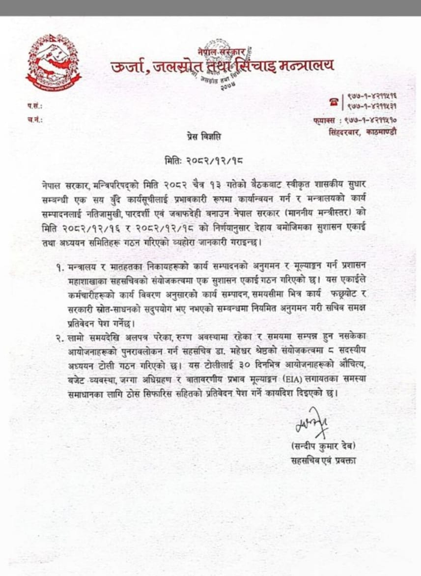 मन्त्रालयका सहसचिव महेश्वर श्रेष्ठको संयोजकत्वमा गठित आठ सदस्यीय समितिलाई ३० दिनभित्र प्रतिवेदन बुझाउने गरी कार्यादेश (ToR) दिइएको छ। समितिले आयोजनाहरूको औचित्य, वर्तमान अवस्था, बजेट व्यवस्थापनमा देखिएका अड्चन, जग्गा अधिग्रहणका समस्या र वातावरणीय प्रभाव मूल्याङ्कन (EIA) का कारण रोकिएका प्रक्रियाहरूको गहन अध्ययन गर्नेछ।